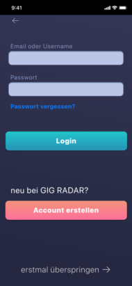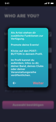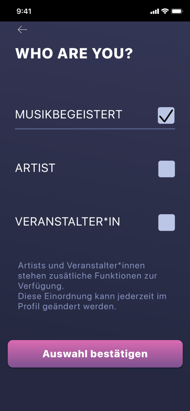 Die Idee von Gig Radar habe ich für Veranstalter*innen, Musikbegeisterte und Interpreten und alle möglichen Überschneidungen der einzelnen Gruppen konzipiert. Im Onboarding oder nach dem Sign-Up wird Nutzer*innen die Möglichkeit gegeben, sich in eine oder mehrere der Kategorien einzuordnen. Veranstalter*innen und Artists haben mehr Möglichkeiten, z. B. das Erstellen von Veranstaltungen.