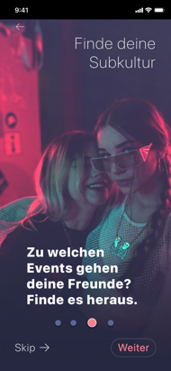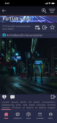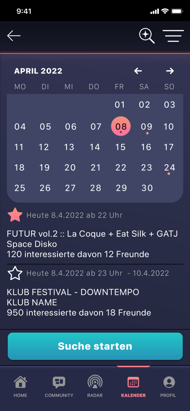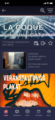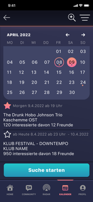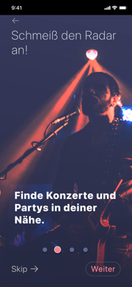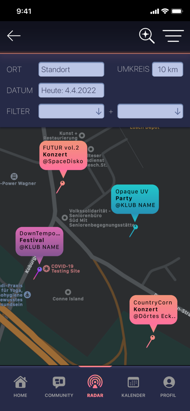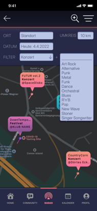 Dabei soll es weiterhin ansprechend aussehen und so wenig wie möglich neue Symbole eingeführt werden, die bei der ersten oder zweiten Anwendung verwirren könnten. Die Suche nach Veranstaltungen im Radar soll gefiltert werden können (z. B. nach Genre) und das Starten der Suchfunktion könnte durch eine ansprechende Animation unterstützt werden.