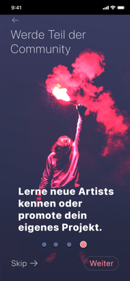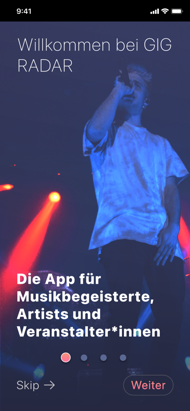 Mit der App sollte man Konzerte und Events in der Umgebung suchen, planen und bewerben können. Eine App sowohl für Fans von Live-Musik, als auch für Veranstalter*innen und Artists.